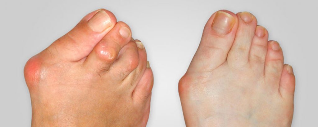 Kecacatan ini adalah progresif dan akan bertambah dengan masa walaupun gejala mungkin atau mungkin tidak serius. Sendi yang diperbesar di pangkal jari kaki (sendi metatarsophalangeal pertama, atau sendi MTP) boleh mengalami radang dengan kemerahan dan kesakitan dibahagian tersebut. Sebuah kantung yang dipenuhi bendalir kecil (berdekatan dengan sendi) juga boleh menjadi radang (bursitis), yang membawa kepada bengkak, kemerahan, dan sakit sampingan. Kesakitan sendi yang lebih serius mungkin berlaku apabila artritis setempat berkembang dan seterunya menyebabkan kecacatan kekal pada kaki sekiranya tidak dirawat.